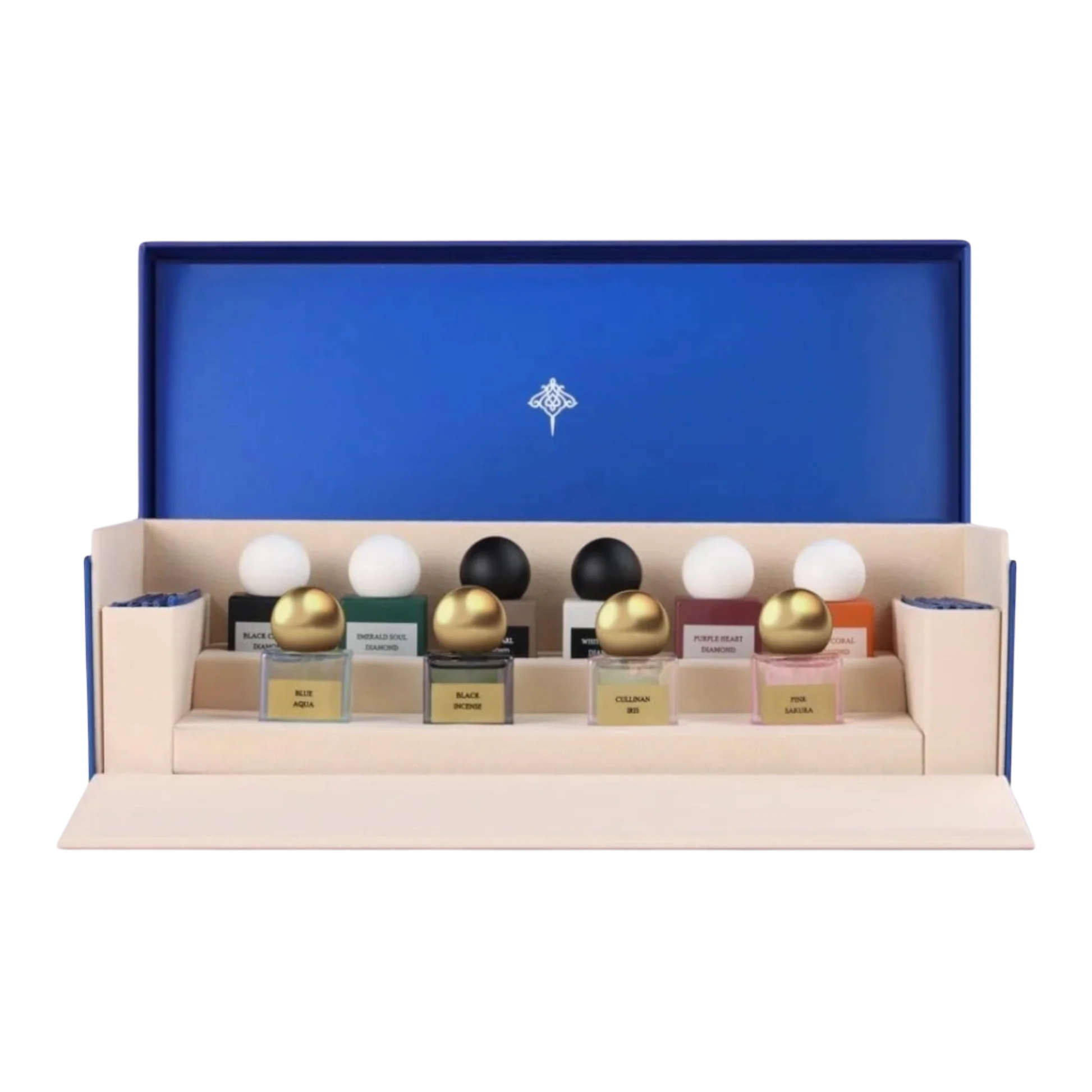 A luxurious, velvet-lined box presenting the complete Diamond Collection in ten travel-ready 10 ml sprays—perfect for discovering your signature or gifting with style.